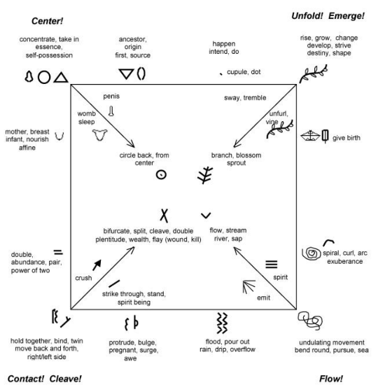 I use as basis for ritual work the mapped layout of a grapho-semantic square for the Double Goddess figure (i.e. figurine, the Hohle Fels Figurine, which looks like a bifurcated Venus of Willendorf figurine). This ritual working makes use of the flow of semiotics from the Upper Paleolithic to allow energy to flow smoothly and fully, to run its full course and to cast spells well. The grapho-semantic square follows (Harrod 2011):
